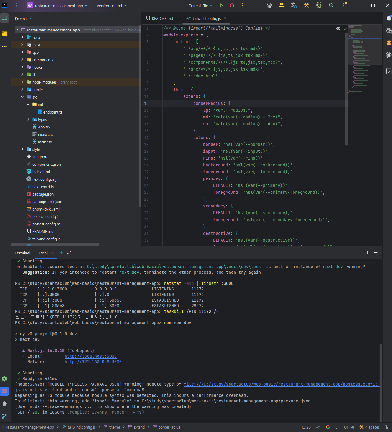 npm install과 npm run dev까지 되는 건 확인했는데 한 번 실행을 시키니 종료를 해도 이전 dev 서버가 완전히 안 죽고 백그라운드에 남아서 새로 켜면 lock 에러가 났다......