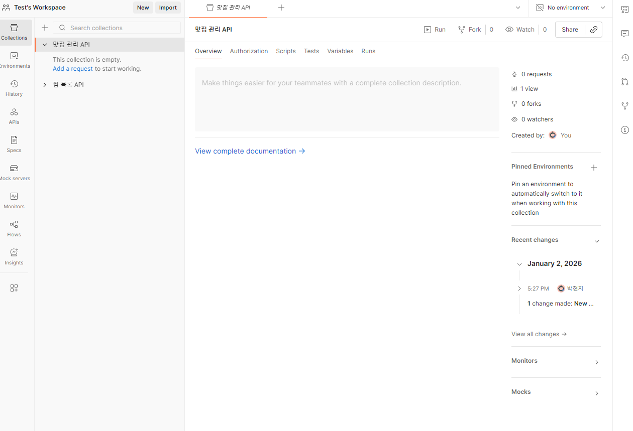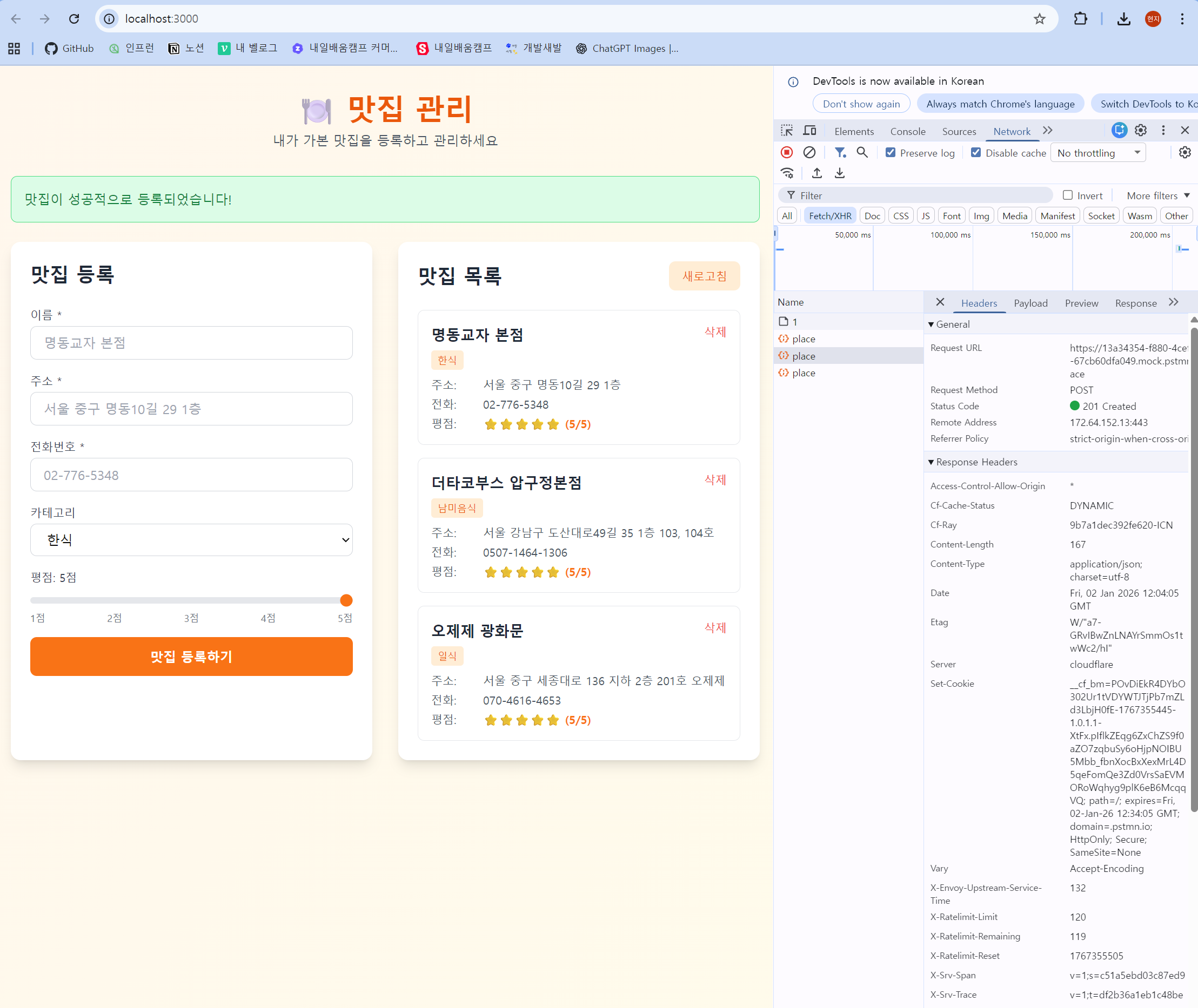 - POST는 새 데이터를 생성할 때 씀. 새 맛집을 추가하는 행위가 생성이기 때문에 POST를 쓴다.