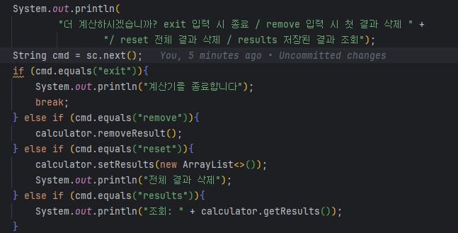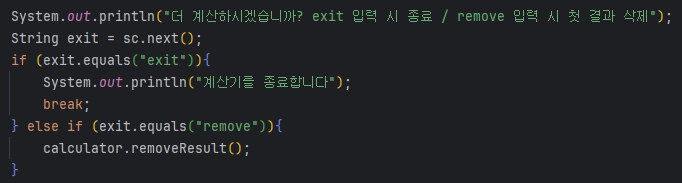 System.out.println("더 계산하시겠습니까? exit 입력 시 종료");