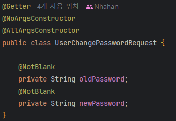 @Pattern(regexp = ".*[A-Z].*", message = "새 비밀번호에는 대문자가 포함되어야 합니당")